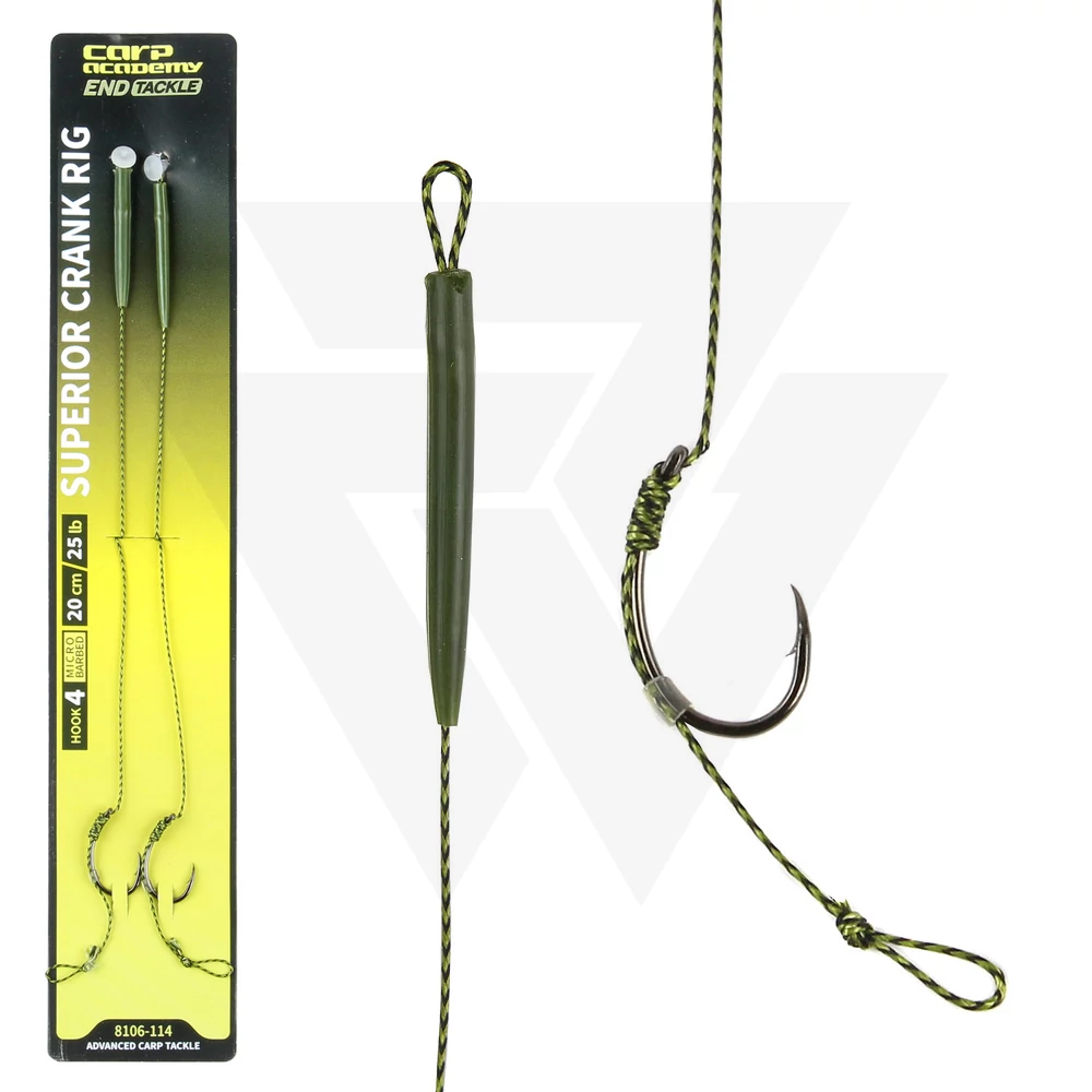 Fonott zsinórra kötött pontyozó előke. Superior Crank horogra kötött kész előke, magas szakítószilrádságú fonott zsinórral kombinálva. A fonottzsinórokra jellemző gubancolódást a kapocsra szerelt szilikoncső akadályozza meg. A készlet tartozéka két gyors forgókapocs is, amelybe a füles kötés beakasztható és a gubancgátlóval rögzíthető, így a különböző méretű előkék gyorsan variálhatóak a szerelékünkön. A horog Super Rig típusú, a hajszálelőke finomabb beállítását a horogra szerelt átlátszó szilikoncső teszi lehetővé.
